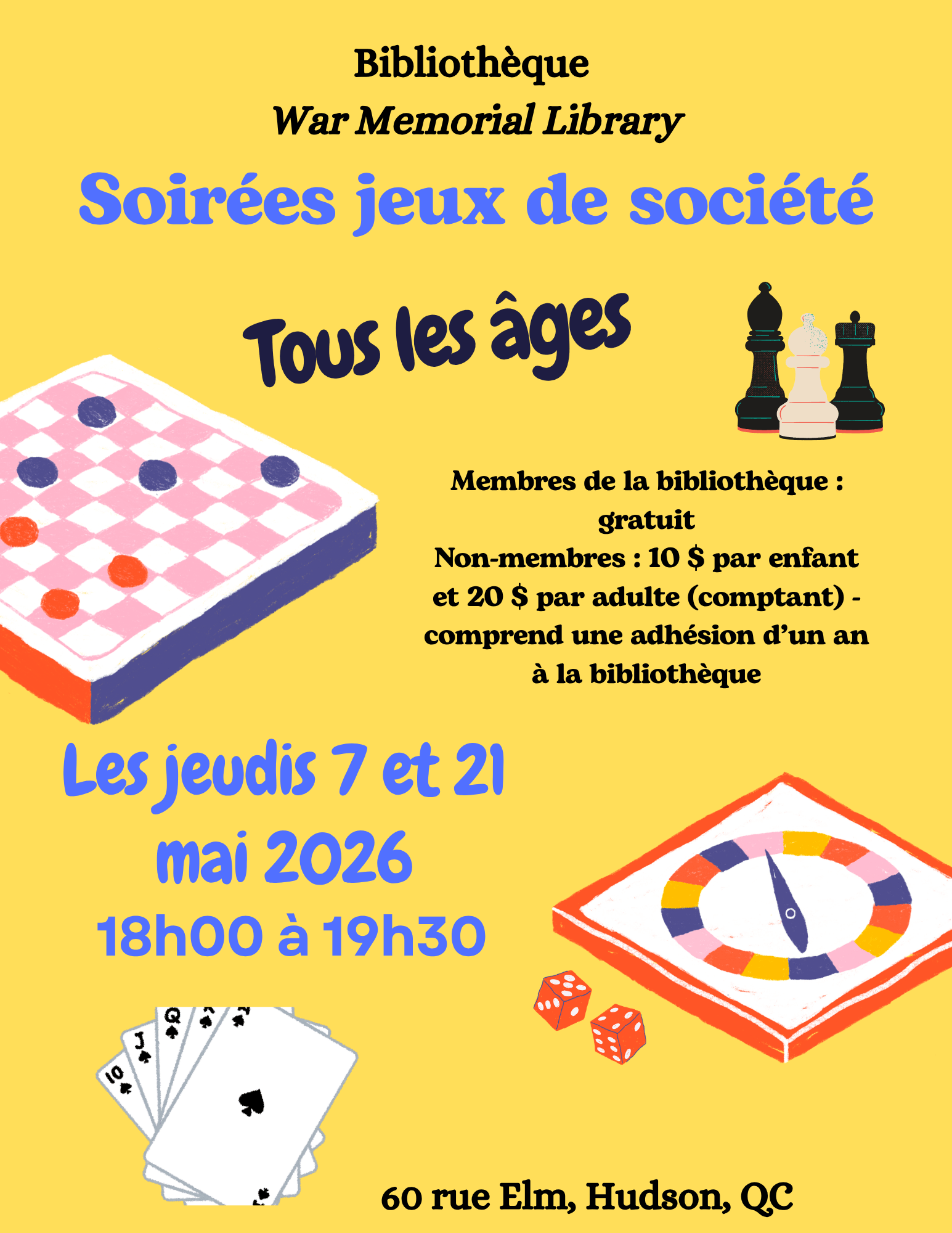 Pour tous les âges! Bibliothèque War Memorial Library, 60, rue Elm. Les jeudis, 7 et 21 mai 2026, de 18 h à 19 h 30. Gratuit pour les membres de la bibliothèque. Non-membres : 10 $ par enfant, 20 $ par adulte (argent comptant seulement). Comprend une adhésion d’un an à la bibliothèque. Les bases du jeu sont fournies.